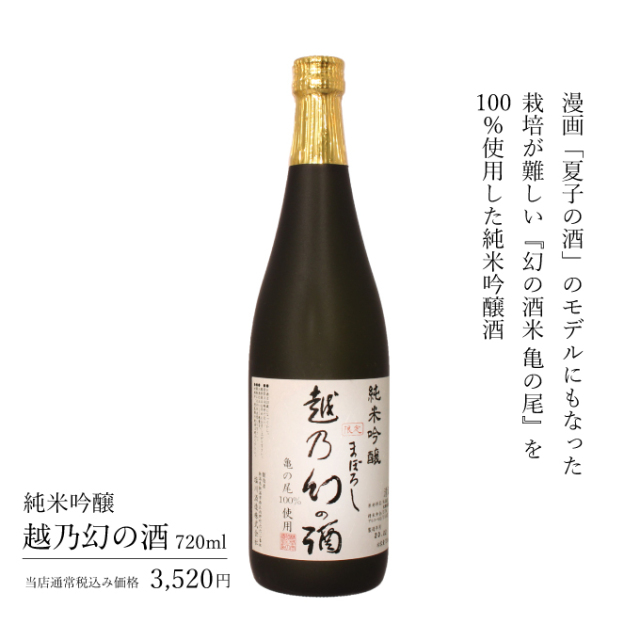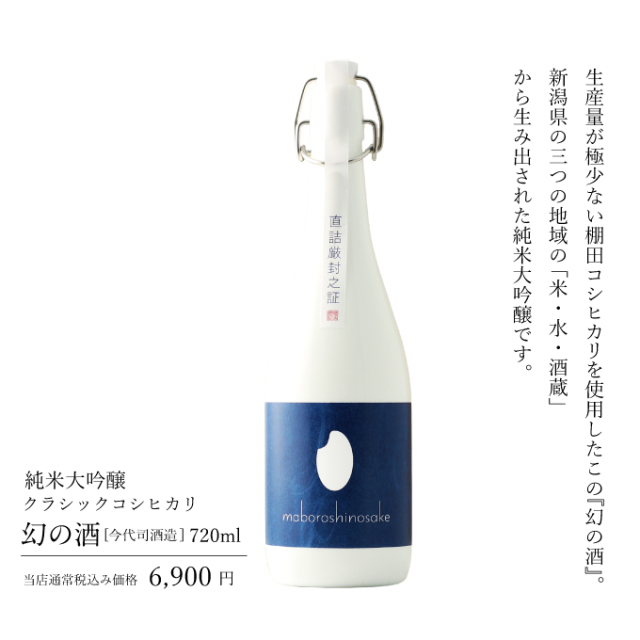 【クラシックコシヒカリ幻の酒(今代司)】 新潟県の「米・水・酒蔵」を地域ごとに分け作ってみたらどうなるだろうか。そんな思いのもと誕生したのがこの『幻の酒』です。それぞれの地域の雪解け水と自然豊かな土地で育った県内でも生産数が希少な極上のご飯米「棚田クラシックコシヒカリ」を原料米として使用した、まさに『幻の酒』です。こちらは、新潟地区「三川村網木の棚田×阿賀野川系網木川×今代司酒造」の棚田コシヒカリ純米大吟醸 原酒です。 【越乃幻の酒】 栽培が難しく幻の酒米と呼ばれ、漫画「夏子の酒」のモデルとなった亀の尾を100%使用した純米吟醸酒。 冷やすと亀の尾ならではの切れ味と後に残る風味が楽しめます。 温めれば飲みやすさが増し、どんなお料理と合わせて飲んでも飲み疲れせずぐいぐいと盃が進みます。