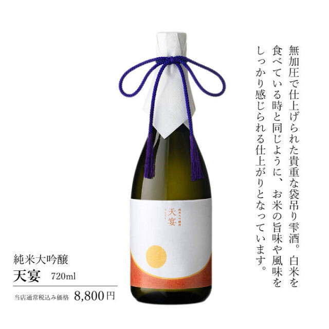 【大彦命】 酒造適合米「越淡麗」を35%まで磨きあげ、また地元で「神の恵み」として守られ続けている湧き水「菅名岳天然水」を使用した非常に贅沢な造りの一本です。旨味成分がギュッと詰まった力強さがある味わいはどんな料理も引き立ててくれます。 【天宴】 無加圧で仕上げられた貴重な袋吊り雫酒。白米を食べている時と同じように、お米の旨味や風味をしっかり感じられる仕上がりとなっています。 スッキリとした飲みやすい甘さがありつつも、後味は日本酒らしい辛みも感じられ多彩な味わいで彩られます。