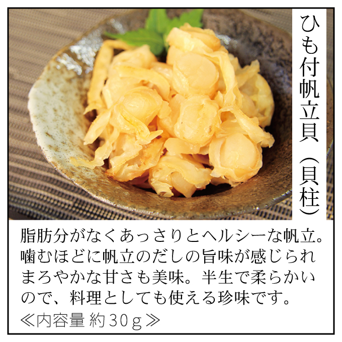 帆立貝柱(国産)、清酒、砂糖、食塩、しょうゆ風調味料、米発酵調味料、醤油/ソルビトール、トレハロース、調味料、(アミノ酸等)、酸味料、メタリン酸Na、(一部に小麦大豆を含む)