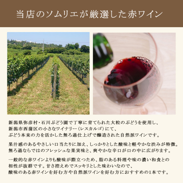 このワインは、新潟県弥彦村・石川ぶどう園の大粒ぶどうを使用し、新潟市西蒲区のワイナリー<レスカルゴ>で丁寧に醸造された1本。