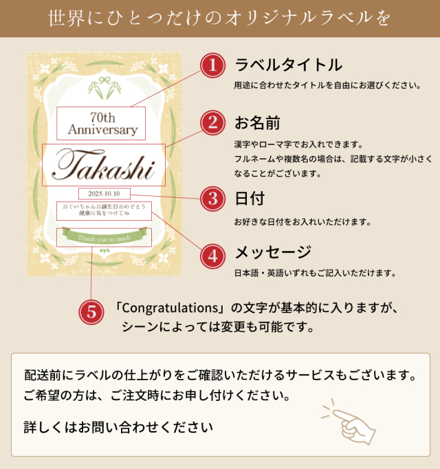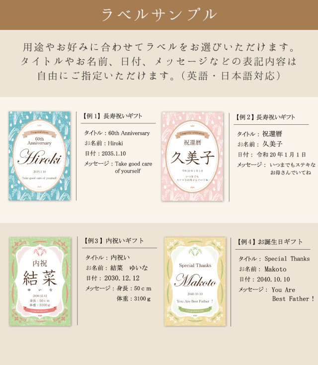 用途・シーン:敬老の日、誕生日、記念日、還暦・喜寿・米寿などの長寿祝い、出産・快気祝い、父の日・母の日など、各種ギフトにおすすめです。
