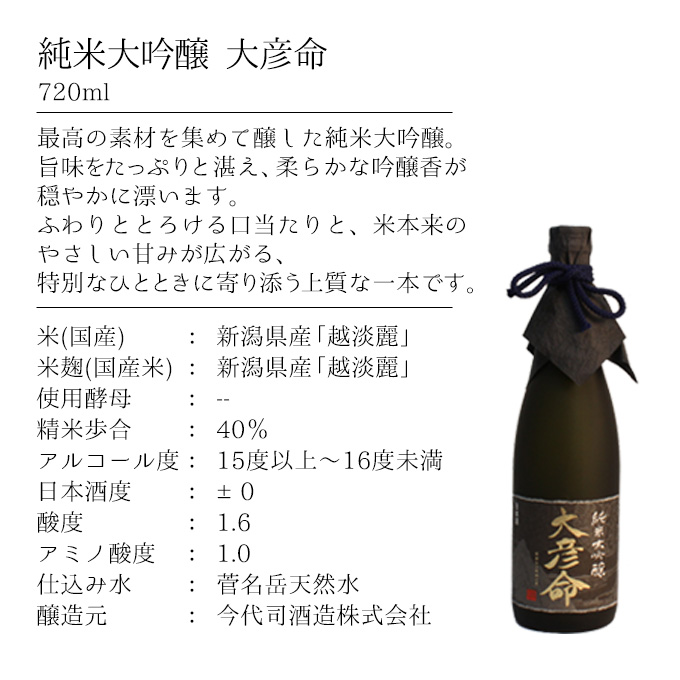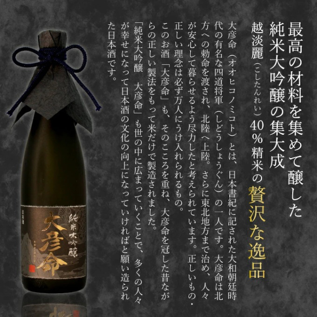 | 製品名: | 純米大吟醸「大彦命」(おおひこのみこと):720ml |